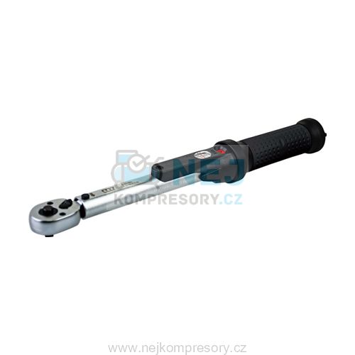 Momentový klíč vyrobený z oceli určený pro profesionální aplikace. Klíč disponuje uvolňovacím tlačítkem na upínání, zamykacím tlačítkem na rukojeti.